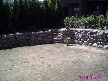In | Natursteinmauer So dekorativ kann die Abstützung eines Hanges sein. In den Hang sind insgesamt zwei Aufgänge mit Stufen aus Natursteinen eingearbeitet worden, die für die Pflege der Bepflanzung aus Kirschlorbeer unerlässlich waren. Die Freifläche davor wurde mit Rasen eingesät. |